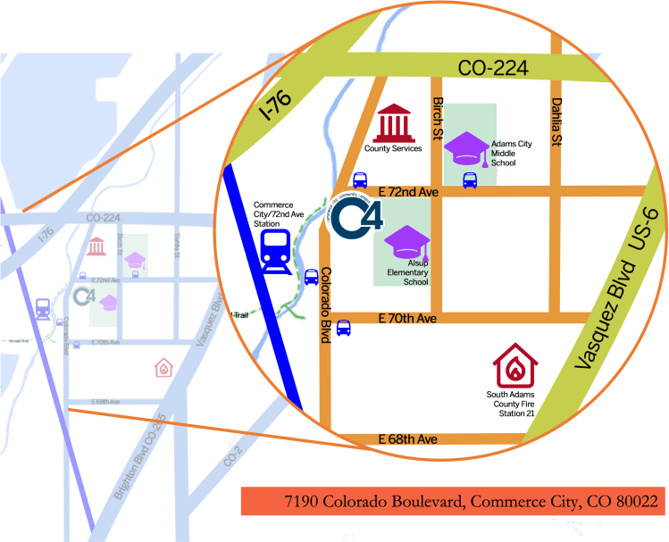 The C4 is located near the 72nd Street N-Line Light Rail Station with multiple RTD bus stops around. The C4 is centralizing health and social services, making it one-stop for patients.